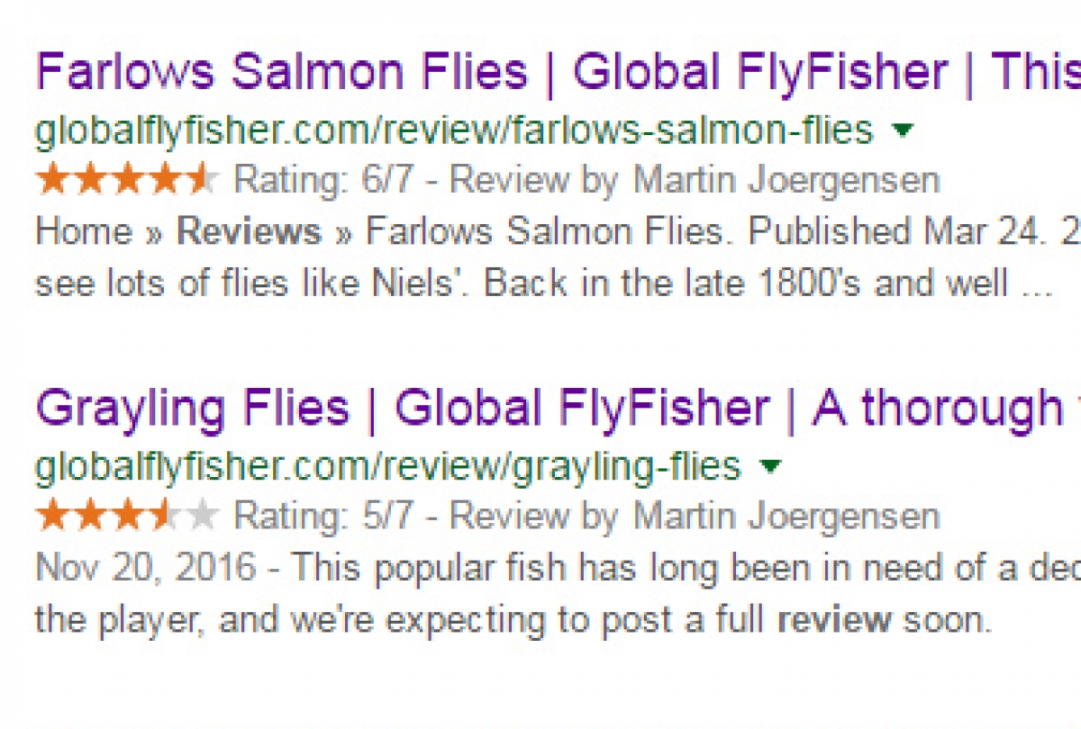 This is NOT about fly fishing or fly tying, but about site development and nerdy stuff.When searching for different things on Google I noticed that a some sites with reviews had their review ratings shown as star symbols in the search result, and I immediately thought “so ein ding...!”. GFF should also have the star ratings from our many reviews shown in Google, and there had to be a way to obtain that.