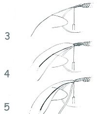 3. Here we tie in the material successively. We begin with that one, that we will use as the last and consecutively we tie further material in the reverse succession, than we will use it. We begin by tying in about 10 cm of nylon line of 0,10 - 0,15 mm diameter, that we will use for final ribbing and strengthening of the fly. We fix the end of nylon line behind the lead turns with the tying thread, the rest is directed to the rear and we proceed with several turns (3-5) to the end of the shank. It is good to flatten the end of the line a bit with help of a forceps. Then it holds better (Ill. 5)