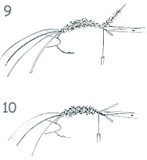 9. We wind the wick in tight dextral turns towards the hook eye. At the eye we leave enough space for finishing the fly. We fix the wick with two turns of the thread and clip off the rest (Ill. 10)