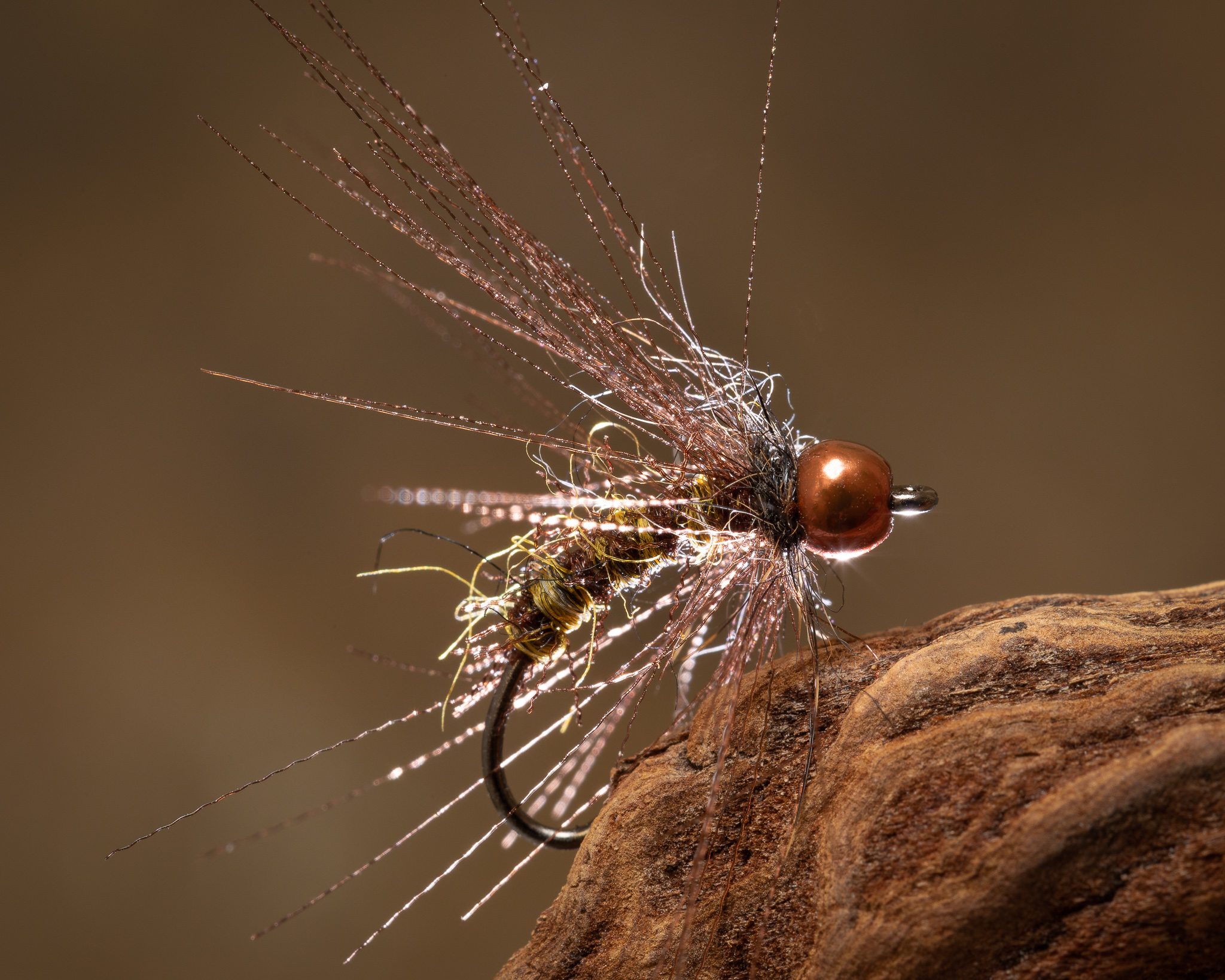 Body Semperfli pale olive Dirty Bug Yarn and stripped brown organza ribbon