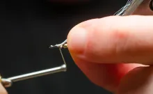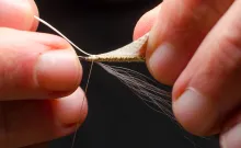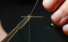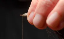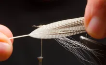 The wing is supposed to lie quite flat over the body, and this is obtained by making sure the thread foundation isn't too tapered, but more cylindrical. Lay down a full feather on top of the hook shank and catch it with a couple of semi-loose thread wraps. Pull the stem to adjust the position and "gather" the feather to a narrow wing and then secure it with a couple of tight wraps.
