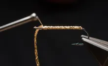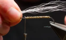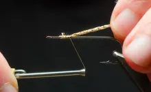 The body can, as already mentioned, be tied in gold or a suitable color like cream or orange. The original prescribed oval gold tinsel wrapped for the body, but I have used a braided gold yarn, which is easier to handle – and much less expensive.