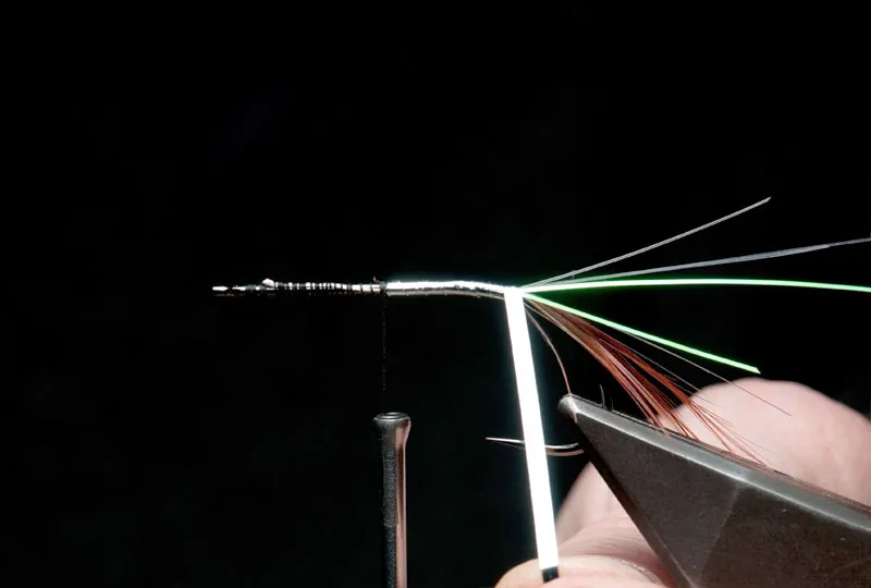 Wrap the tinsel to the rear of the hook shank. When you start wrapping, the tinsel turns over to show the silver side