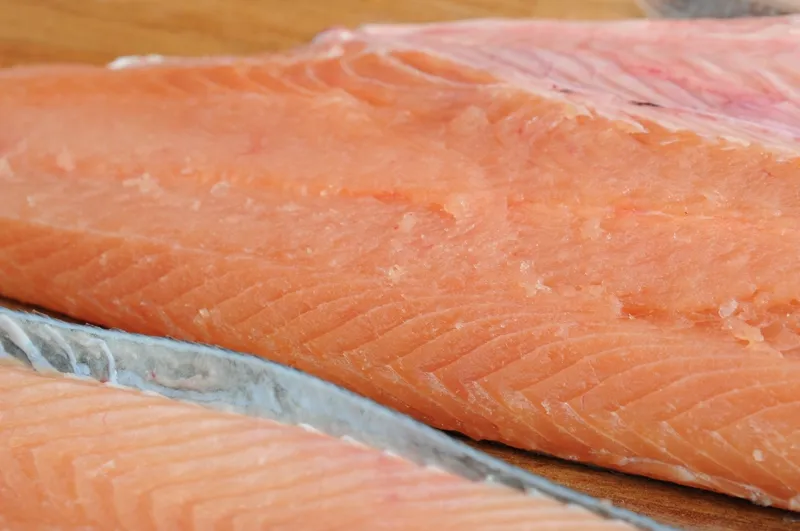 The filets cut off the fish still have skin and ribs on them. Lay the filet flat on the board, skin down. Come in with the knife flat against the board from the tail and cut gently towards the front to free the meat from the skin. Trim off the ribs and floppy belly meat as thinly as you can.