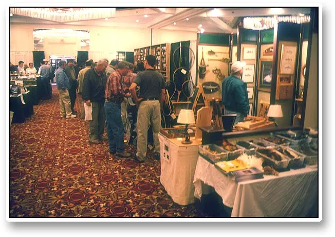 Narrow aisles with booths of plenty. Any fly tyer will be tempted passing between these shops.