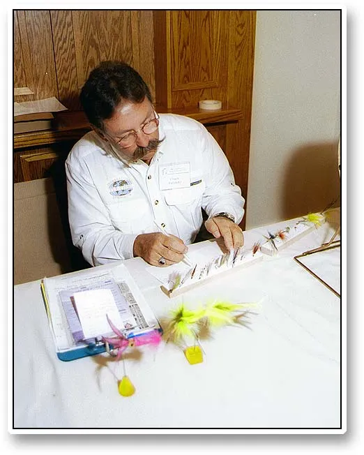 Chuck Furimsky - head of the IFTS - judging the saltwater category of the FlyMeister 2001 fly tying contest.