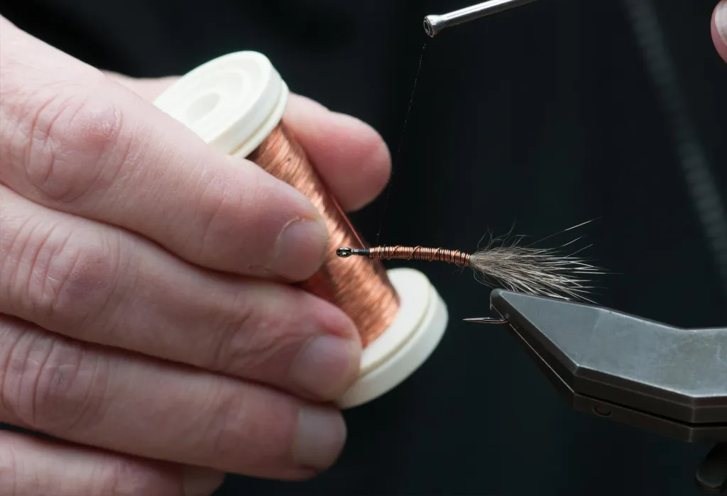 Catch the copper wire with the tying thread and tie it down with a couple of wraps