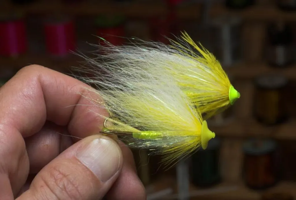 The flat heads will make the water turbulent as it passes over the wing. The front fly is tied with a rubber head to use where weighted flies are not allowed. The rear one uses a flat metal cone. Flies tied by Ken Bonde Larsen.