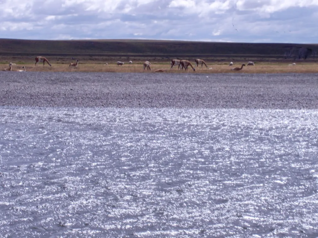 Guanacos (Lama Guanicoe) an indigenous member of the camel family graze amongst sheep on the banks of the Rio Grande.