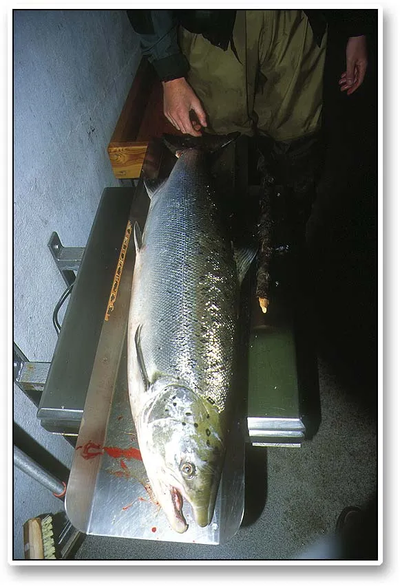 Most salmon caught in high season are kept. The ritual of carrying the large fish along the stream to the shack where weighing, registration and cleaning takes place is a highlight for many fishers.