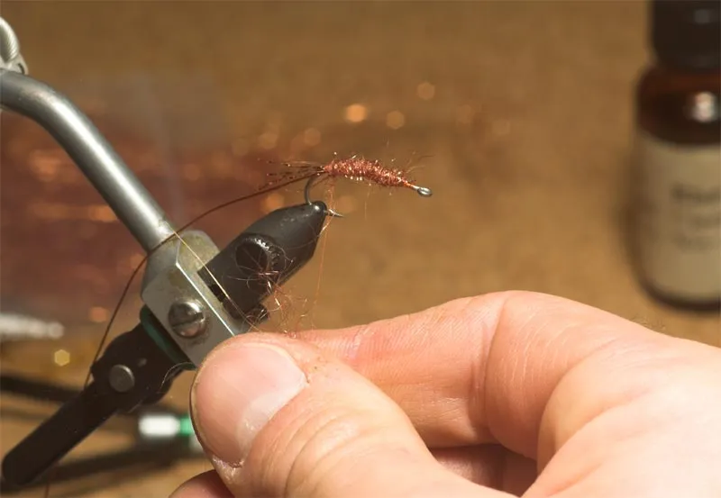 Form the body by winding the dubbed thread forwards. The thin dubbing means that you need a couple of layers to obtain the right thickness