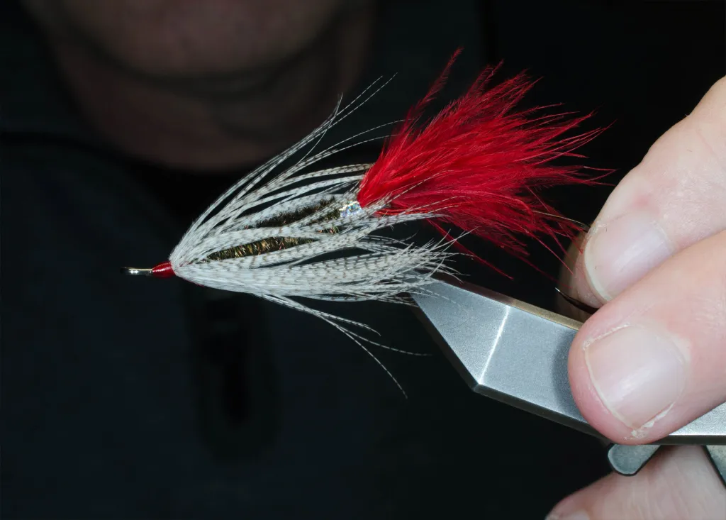 The finished fly with the long, sweeping hackle and a trailing hook.
