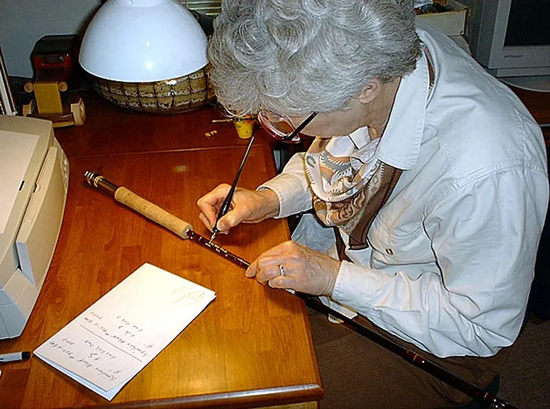 Mary Lu Lewis writing on a rod. Patience and a steady hand is the key - and practice