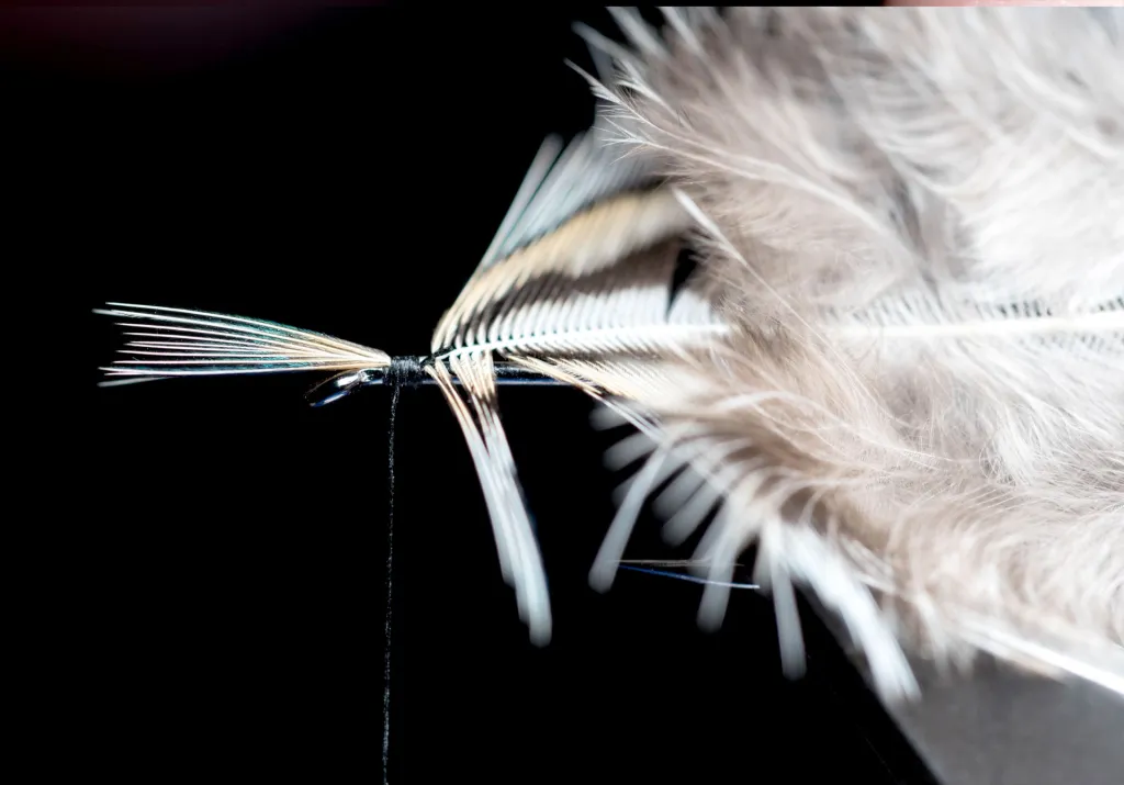 Tie the short feather in tip first by stroking back som barbs and catching the outmost barbs. Keep the curved side pointing away from the hook