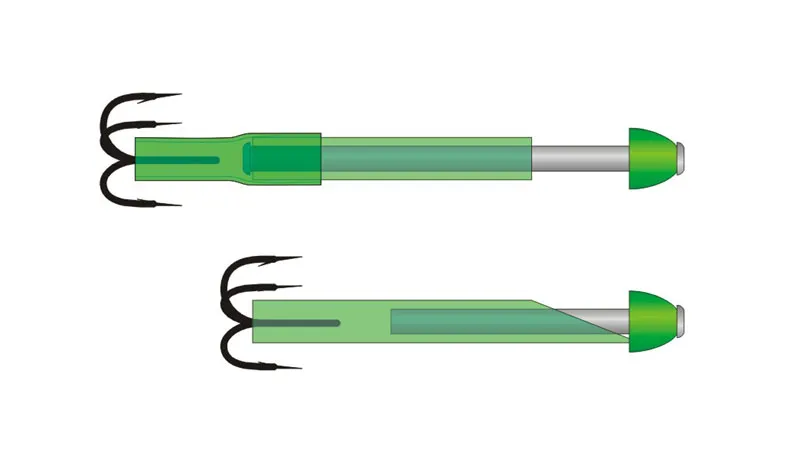 On top the inner tube is stuck all the way through the outer tube and melted in the rear. you tie on the small tube right in front of the outer tube and use a soft connection tube to hold the hook.