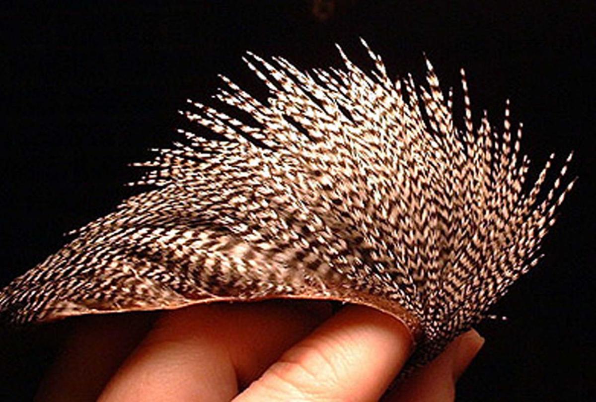 Dennis is rightly proud of these hen skins. They are bred to serve as dry fly wings on traditional dry flies. Each skin comes with a complete neck and saddle patch. These are called "J V" because they are not yet mature birds. Taken early in their growth, the neck hackles especially are nicely shaped for wings, with rounded points and a nice web line. The saddles show feathers with solid web that will produce excellent soft hackle wet flies or even can be used to make cut wings for more realistic dry flies. You can't find these hackles elsewhere. Most hen necks have hackles that are long and thin, with pointed tips and relatively little web, another by-product of breeding for dry fly hackle. Dennis understands what fly tyers want, and he produces hackles to satisfy those needs.