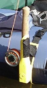 The Float-n-Tote rod holder straps on easily to the pontoon of your float tube.