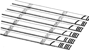 Now we come to the splitting, that can be a very difficult job - but we use a method learned from Bjarne Fries - another clever Danish rod-builder. In a vice we place a knife-blade with the point upwards and protected by a metal-ball (so that one doesn't harm oneself during the splitting). The edge of the knife pointing towards you. In preparation one has with a speed-marker drawn short lines along the whole bamboo-piece, where it is to be be split. Then the end is pressed against the edge of the knife and during the whole splitting-process the surface of the bamboo must be exactly at an angle of 90 deg. to the knife. Then one presses the bamboo against the knife and as a start it can be needed to make a short 'rap' at the other end of the bamboo. By pressing the bamboo against the knife the bamboo is split: One keeps ones hands as close to the knife as reasonable, and following the marks the total length is split. Should it move out of range one presses with one of the hands at the side of the bamboo just to the side of the knife, so that the split goes back on the right course.