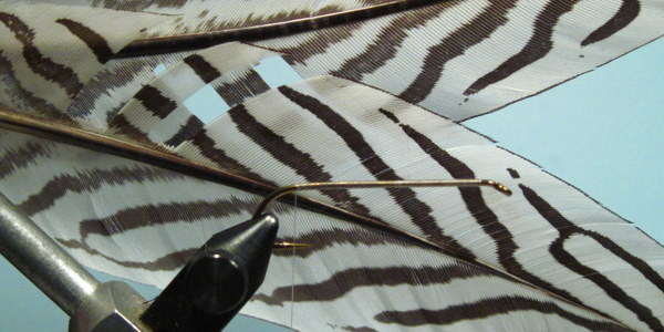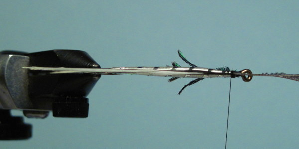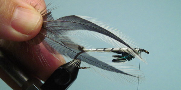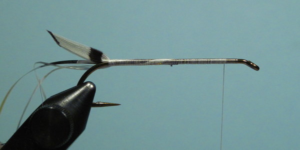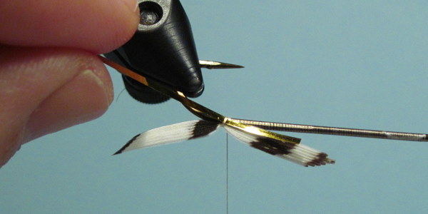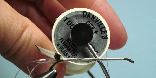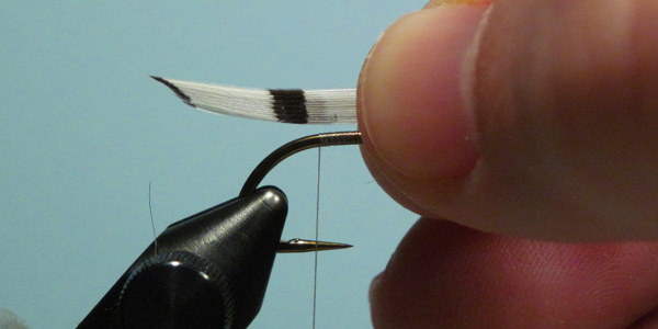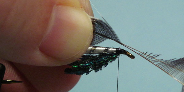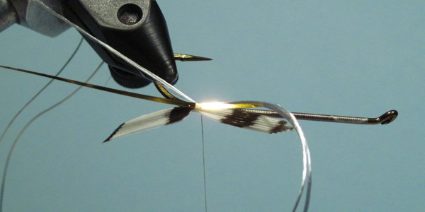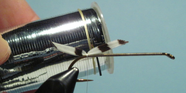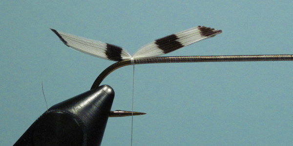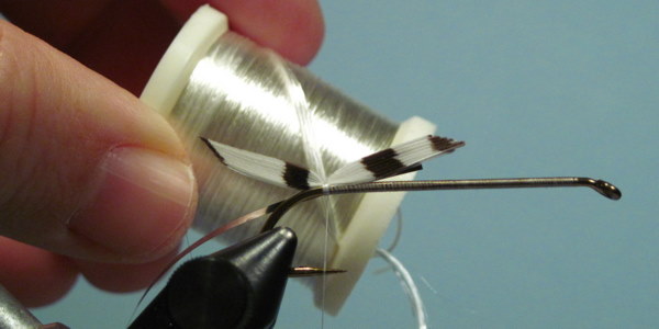 The wing tied in with a few wraps of thread. Check for position before securing with several firm wraps.
