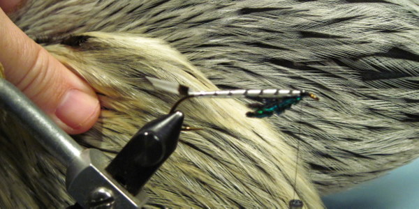 Even though we have a flat and level tie-in area, it never hurts to strip off a few fibers off the bottom of the wing hackle. This will help prevent it from canting up at an odd "open jack knife" type angle.