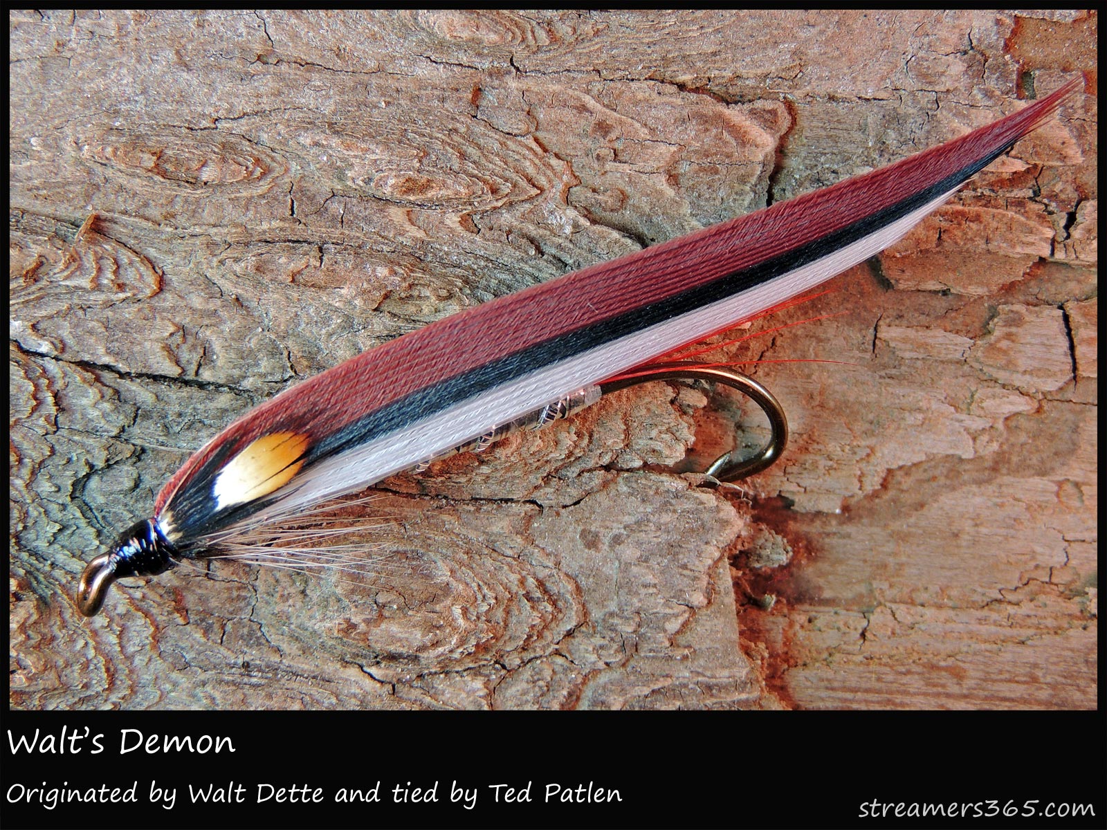Walt's Demon - Ted Patlen Tied by: Ted Patlen Originated by: Walt Dette Source: Trout, Bergman Plate 10 Hook: Mustad 9575 Thread: Black 8/0 Tail: Red...