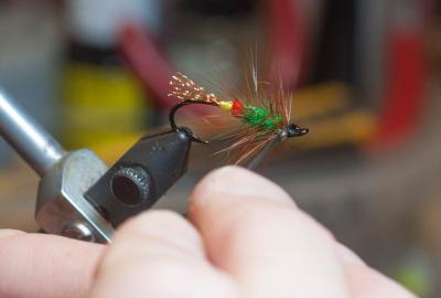 When you varnish, cement or glue the head of a fly, and the stuff runs into the hook-eye, use a small feather (hackle) as a clearing-brush. Just poke the feather stem into the eye, and pull it through while the varnish is still wet.